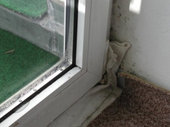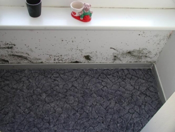 Schimmelpilzbildung im Laibungsbereich des Fensters.